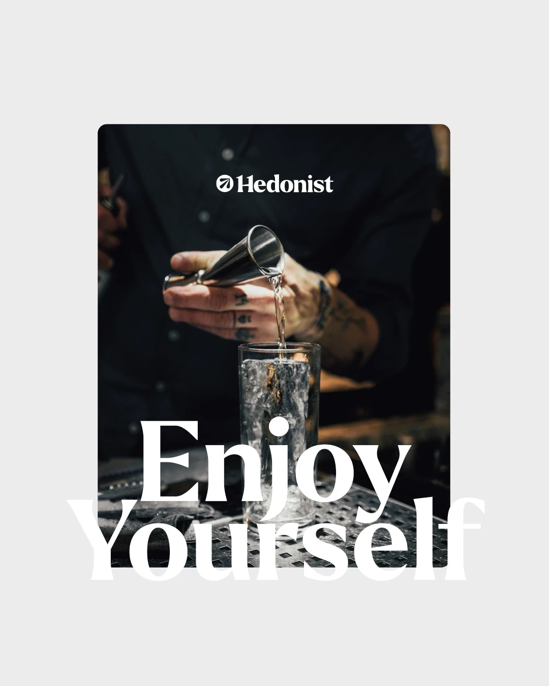— Brief As Hedonist grew beyond its Leeds roots, it needed a more refined identity — one that balanced creativity with strategy. The aim was to introduce character and add polish for a broader, high-end audience. — Approach The rebrand leaned into the name — a celebration of pleasure. A curved arrow logo symbolised pursuit and joy and represented the newly streamlined three strands of the business, while the 'H' in the wordmark carried hidden nods to the 11 Hydrogen atoms found in dopamine. Every detail added richness, intimacy, and intent — a brand built to feel both playful and elevated.